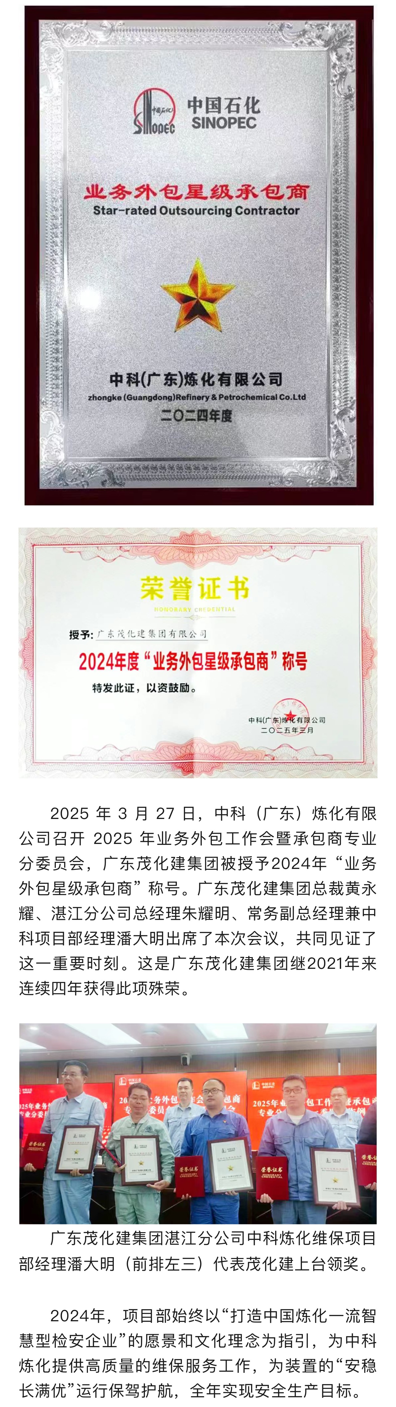 喜報(bào)|榮獲2024年中科煉化 “業(yè)務(wù)外包星級(jí)承包商”稱號(hào)