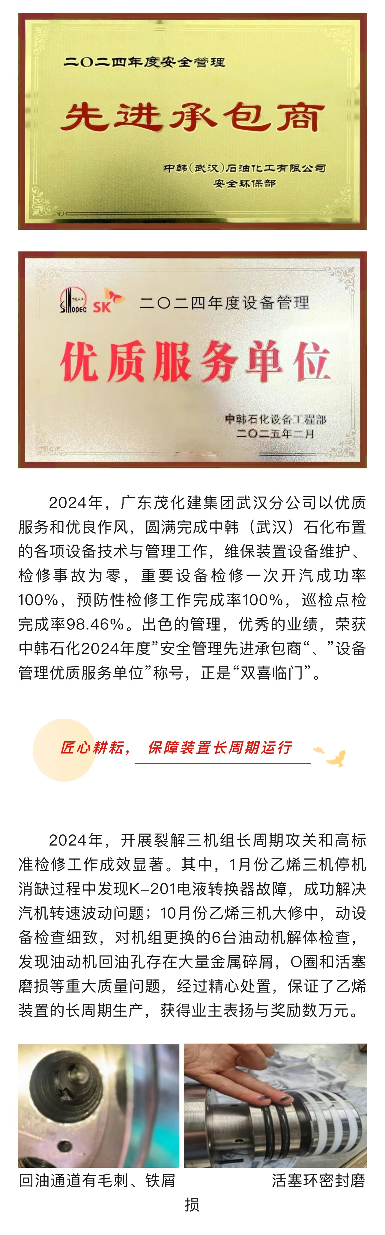 雙喜臨門 | 武漢分公司榮獲2024年度中韓石化“安全管理先進(jìn)承包商”、“設(shè)備管